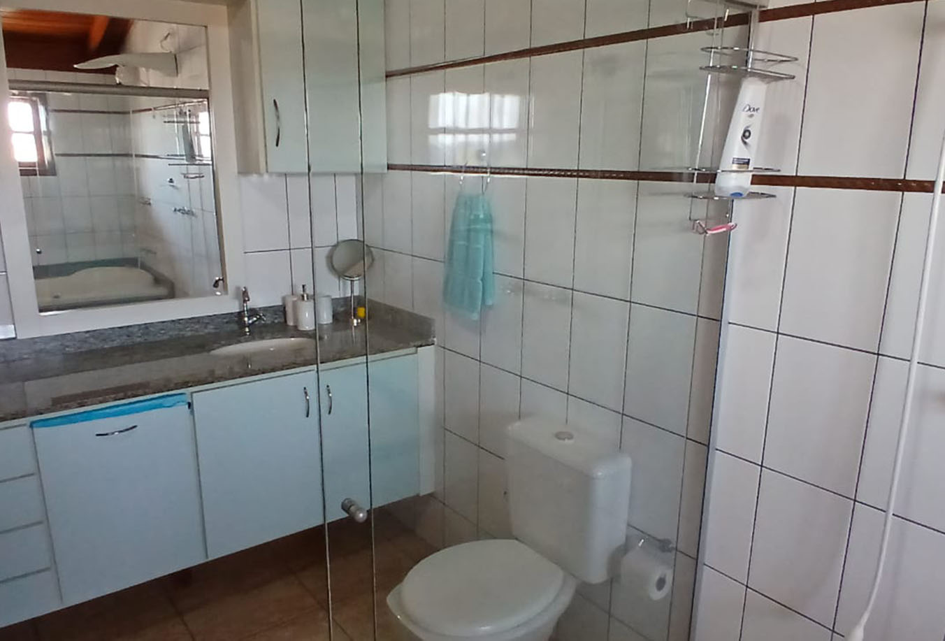 Banheiro com gabinete, box, chuveiro e ampla banheira com aquecimento a gás